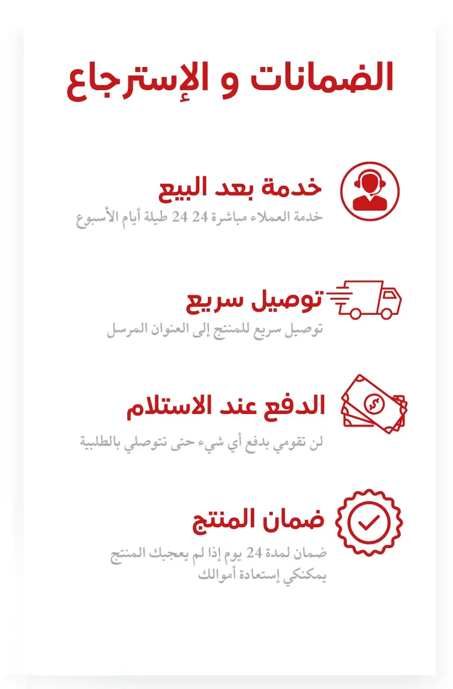 جميع المنتجات المعروضة في متجرنا تخضع لسياسة الاستبدال واسترداد الأموال وفقًا للشروط والأحكام المبينة على هذه الصفحة.